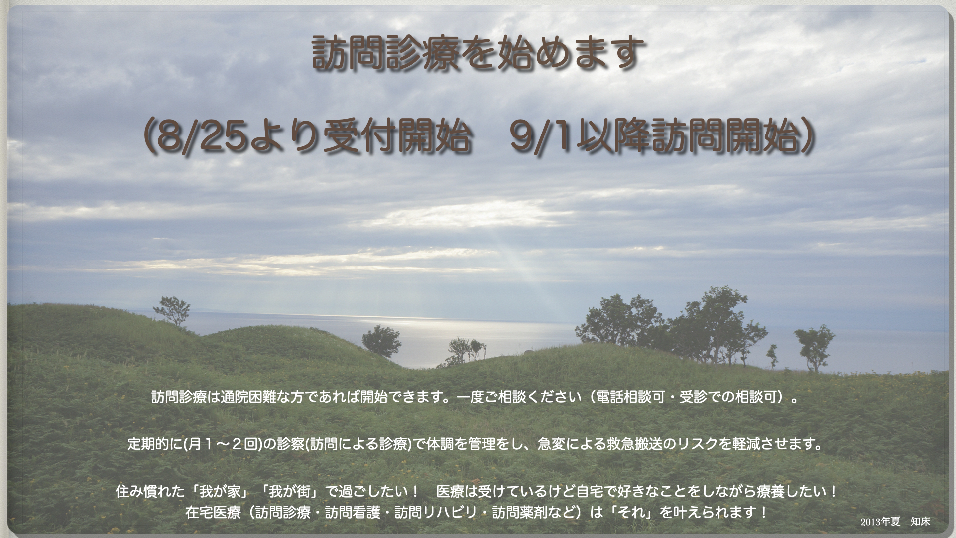 訪問診療開始のお知らせ:8月25日(月)より受付開始いたします。契約及び訪問診療開始は9月1日以降で予定を立てさせていただきます。詳細は、「訪問診療」欄をご覧ください。電話でのご相談や直接受診でのご相談も可能です。よろしくお願いいたします。それに伴いまして、午後の診療開始が15:00以降になることもあります(診療開始まで待合室でお待ちください)。何卒ご理解の程よろしくお願いいたします。