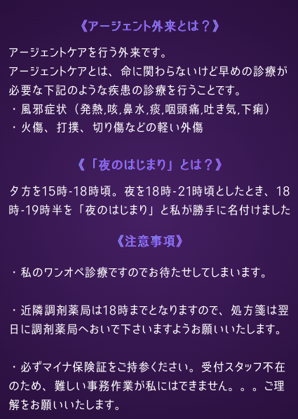 かぜ、頭痛、インフルエンザ、新型コロナ、腹痛、下痢便秘、頻尿、排尿障害など